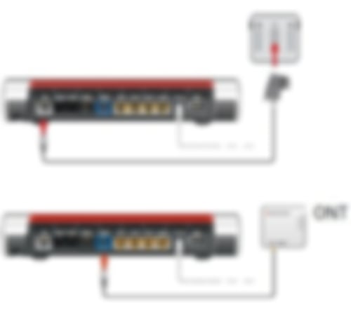 Hardware-Verbindung: Ihre FRITZ!Box muss über den WAN-Port (bei älteren Modellen über LAN 1) mit dem Glasfaser-Modem (ONT) verbunden sein. Bei einem DSL-Anschluss wird das TAE Kabel mit der TAE-Anschlussdose verbunden.